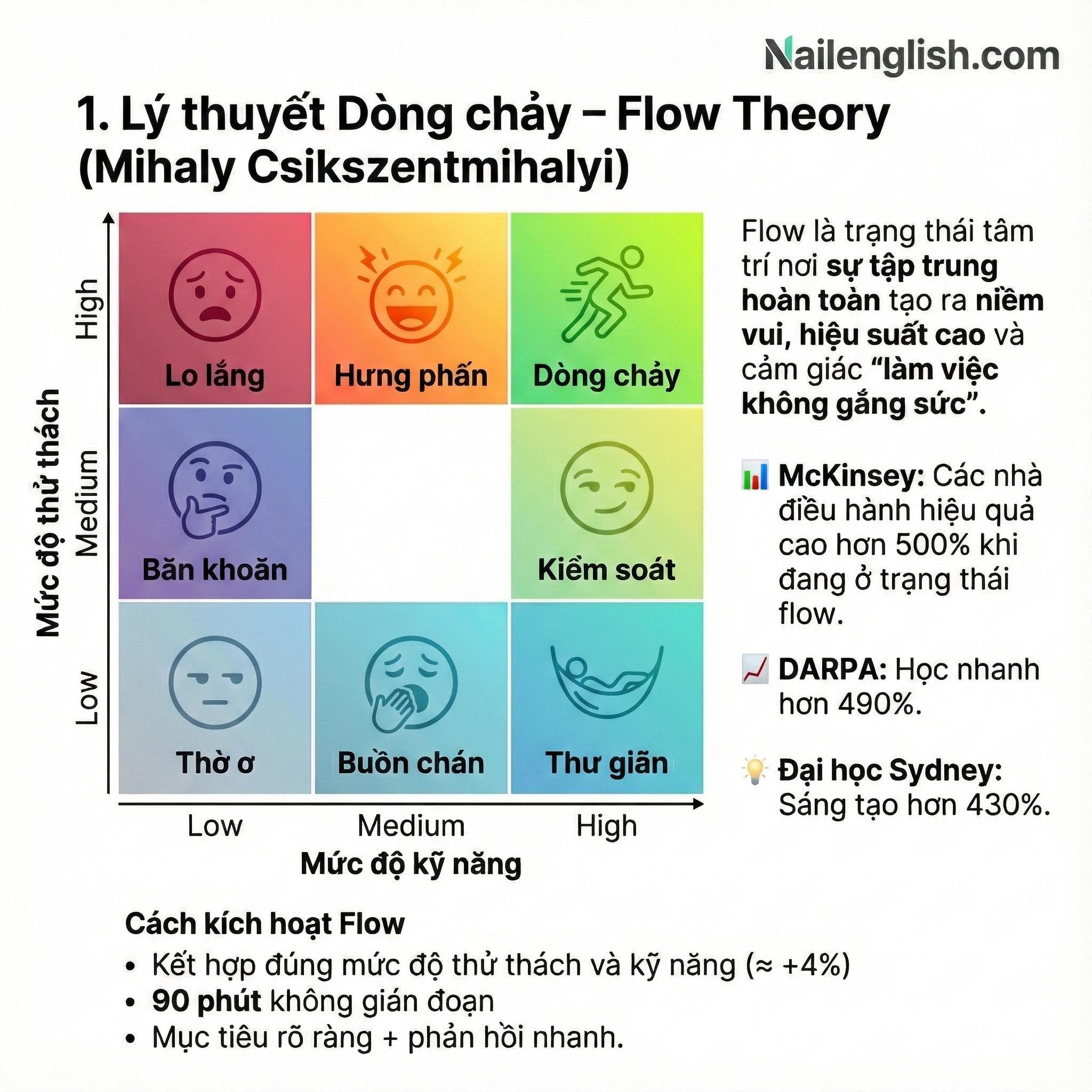 Tại Nailenglish.com, Thầy Adam và team luôn cố gắng áp dụng triệt để lý thuyết này vào việc thiết kế bài học. Mục tiêu là để việc học của các bạn không rơi vào vùng “Lo lắng” hay “Buồn chán”, mà luôn nằm trong “Dòng chảy” hứng khởi nhất của việc học.